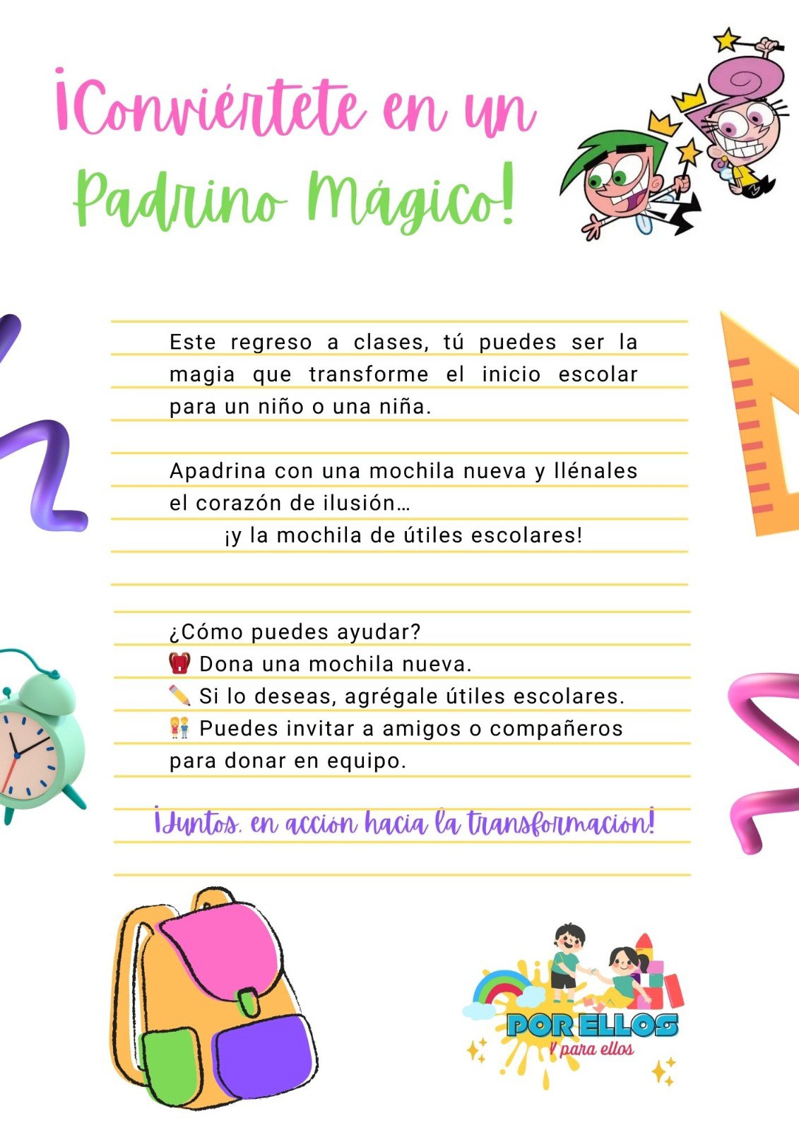 El voluntariado Por Ellos y Para Ellos lanzó una nueva convocatoria del programa “Padrinos Mágicos”, con el objetivo de reunir mochilas y útiles escolares para 18 niñas y niños antes del inicio del próximo ciclo escolar.