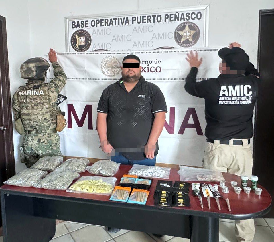 Puerto Peñasco, Sonora, 18 de septiembre de 2025.- En operativo conjunto entre la Agencia Ministerial de Investigación Criminal (AMIC) y la Secretaría de Marina Armada de México (SEMAR), fue capturado Francisco Arturo “N”, de 32 años, tras una persecución en Puerto Peñasco, donde se aseguró droga y un vehículo con reporte de robo en los Estados Unidos de América.