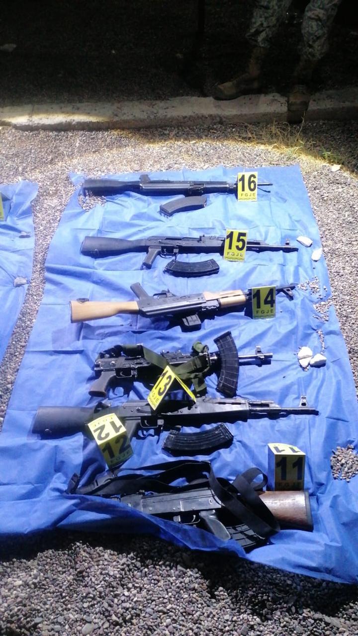Durante el cateo, se aseguraron dos vehículos: una camioneta GMC Sierra modelo 2019, color rojo con reporte de robo en Estados Unidos de América y un pick up Ford Ranger modelo 1982, color blanco; además, se localizaron y aseguraron siete armas de fuego, incluyendo un fusil MP5 con su respectivo cargador abastecido, cinco fusiles AK-47 con sus respectivos cargadores abastecidos, calibre 7.62×39 milímetros, y un fusil AK-47 sin culata, también con su respectivo cargador abastecido.