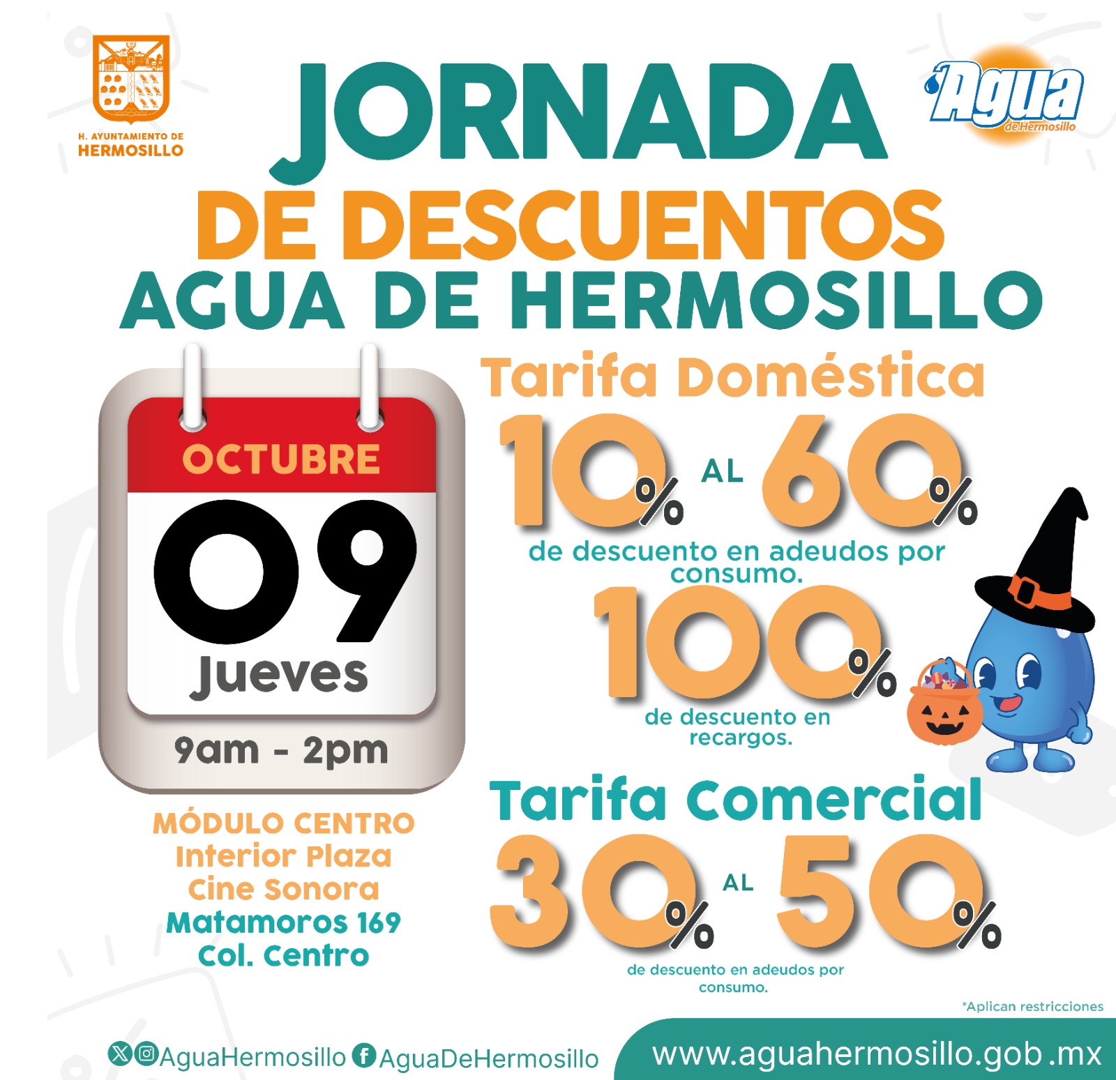 Hermosillo, Sonora; 8 de octubre de 2025 .- Agua de Hermosillo convoca a sus usuarios a participar en la Jornada de Descuentos que se llevará a cabo el jueves 09 de octubre, en el Módulo Centro Interior Plaza Cine Sonora, en un horario de 9:00 a.m. a 2:00 p.m.