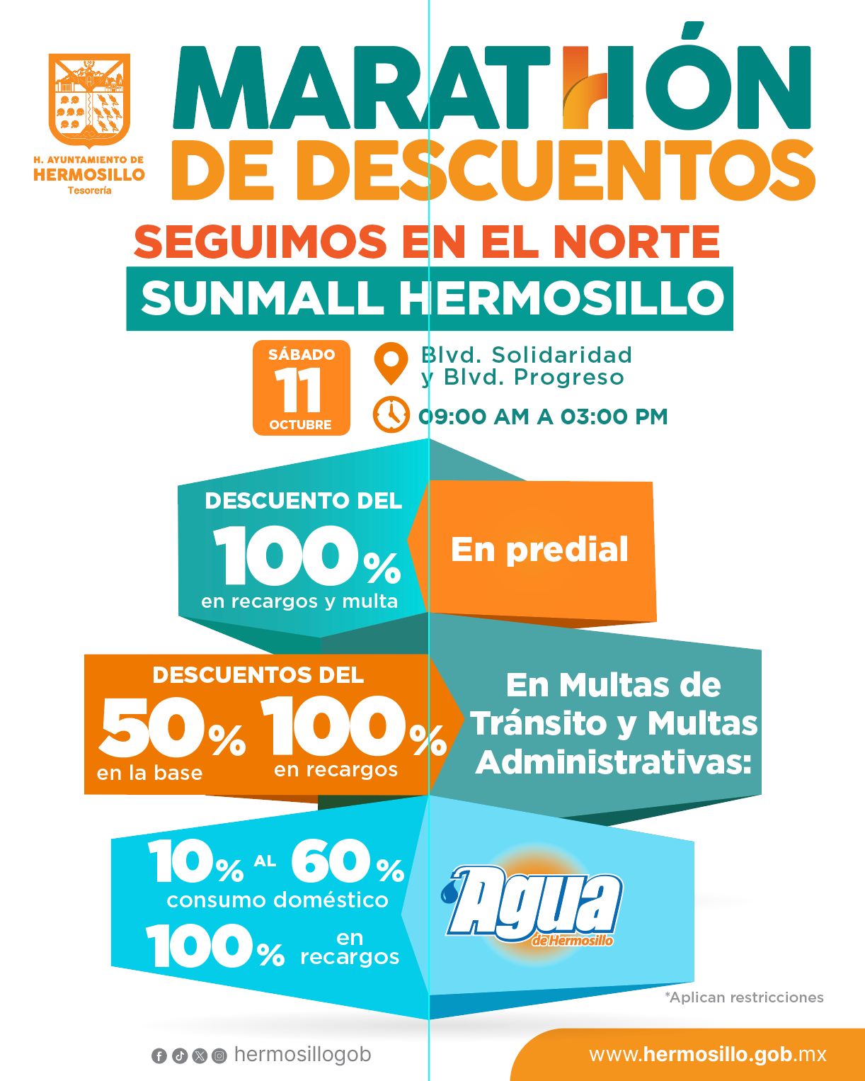 Hermosillo, Sonora; 8 de octubre, 2025.- El Gobierno Municipal de Hermosillo realizará el próximo sábado 11 de octubre un nuevo “Maratón de Descuentos” en la plaza comercial Sun Mall, de las 9:00 a las 15:00 horas, informó Yazmina Anaya Camargo.