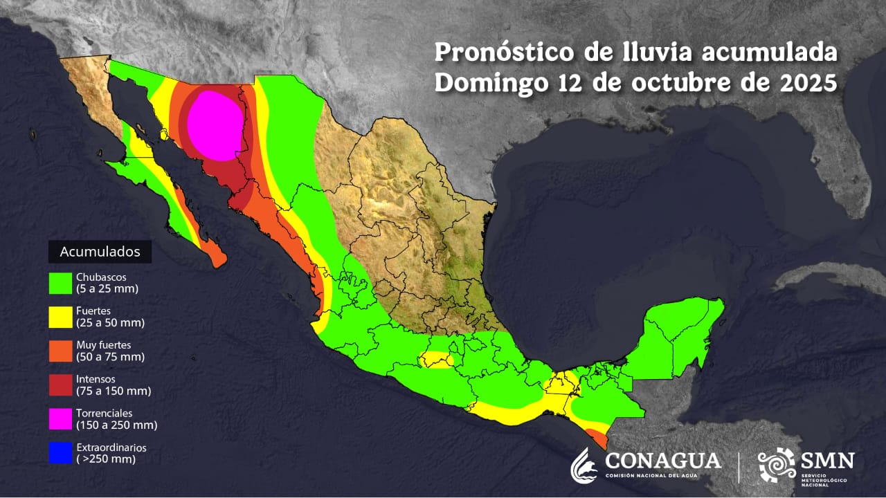 Los remanentes del ciclón interaccionarán con el frente frío número 6, por lo que se pronostican lluvias intensas (de 75 a 150 milímetros [mm]) para este sábado y lluvias torrenciales (de 150 a 250 mm) durante el domingo, en regiones de Sonora, así como vientos fuertes (desde 40 hasta 70 kilómetros por hora [km/h]), durante el fin de semana. Para el lunes, se prevén lluvias puntuales fuertes (de 25 a 50 mm) y rachas de viento de 50 a 70 km/h, en la misma entidad.