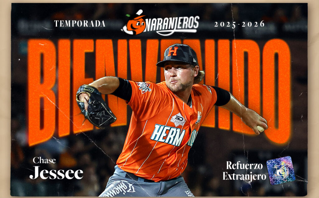 NSN: El lanzador Chase Jessee se integra a los Naranjeros de Hermosillo para apoyar en el bullpen en la temporada 2025-2026 de la Liga ARCO Mexicana del Pacífico.
