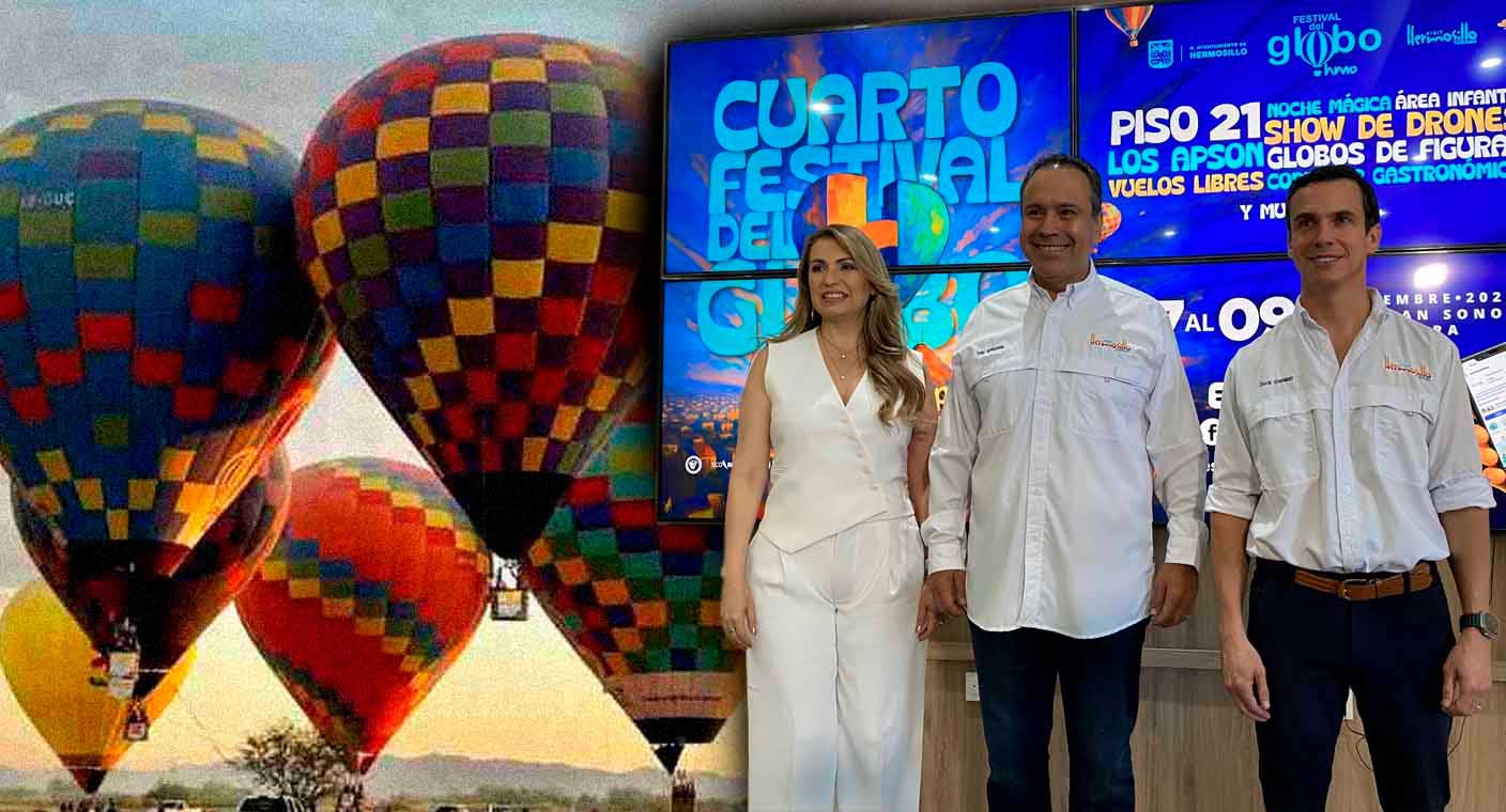 Hermosillo, Sonora; 24 de octubre, 2025.-Hermosillo está listo para llenarse de color, música y diversión con la cuarta edición del Festival del Globo, anunció el presidente municipal Antonio Astiazarán, quien invitó a las familias a disfrutar de este espectáculo único que combina paisajes inolvidables con 20 globos aerostáticos, concierto gratuito de Piso 21 y muchas actividades.