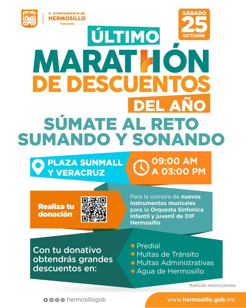 Hermosillo, Sonora; 24 de octubre, 2025.- El Gobierno Municipal de Hermosillo, a través de Tesorería, invita a las y los hermosillenses a aprovechar el último Maratón de Descuentos del año con el reto “Sumando y Sonando”, que se realizará este sábado 25 de octubre.