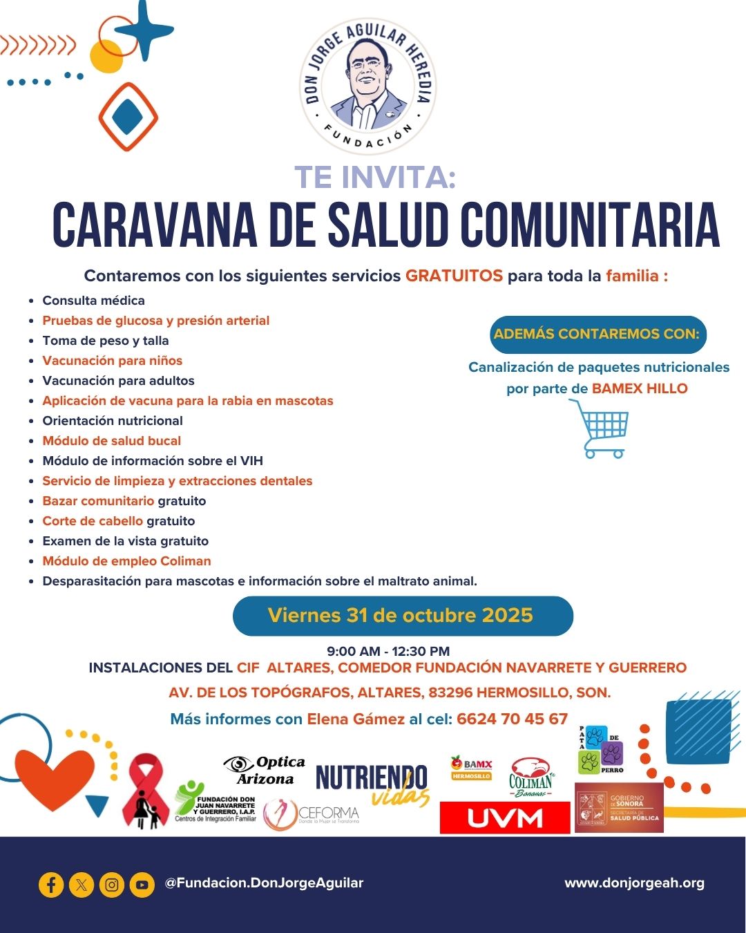 Con el objetivo de acercar servicios médicos y de bienestar a las familias de Hermosillo, la Fundación Don Jorge Aguilar Heredia realizará la Caravana de Salud Comunitaria el próximo viernes 31 de octubre de 2025, en las instalaciones del CIF Altares, Comedor Fundación Navarrete y Guerrero.