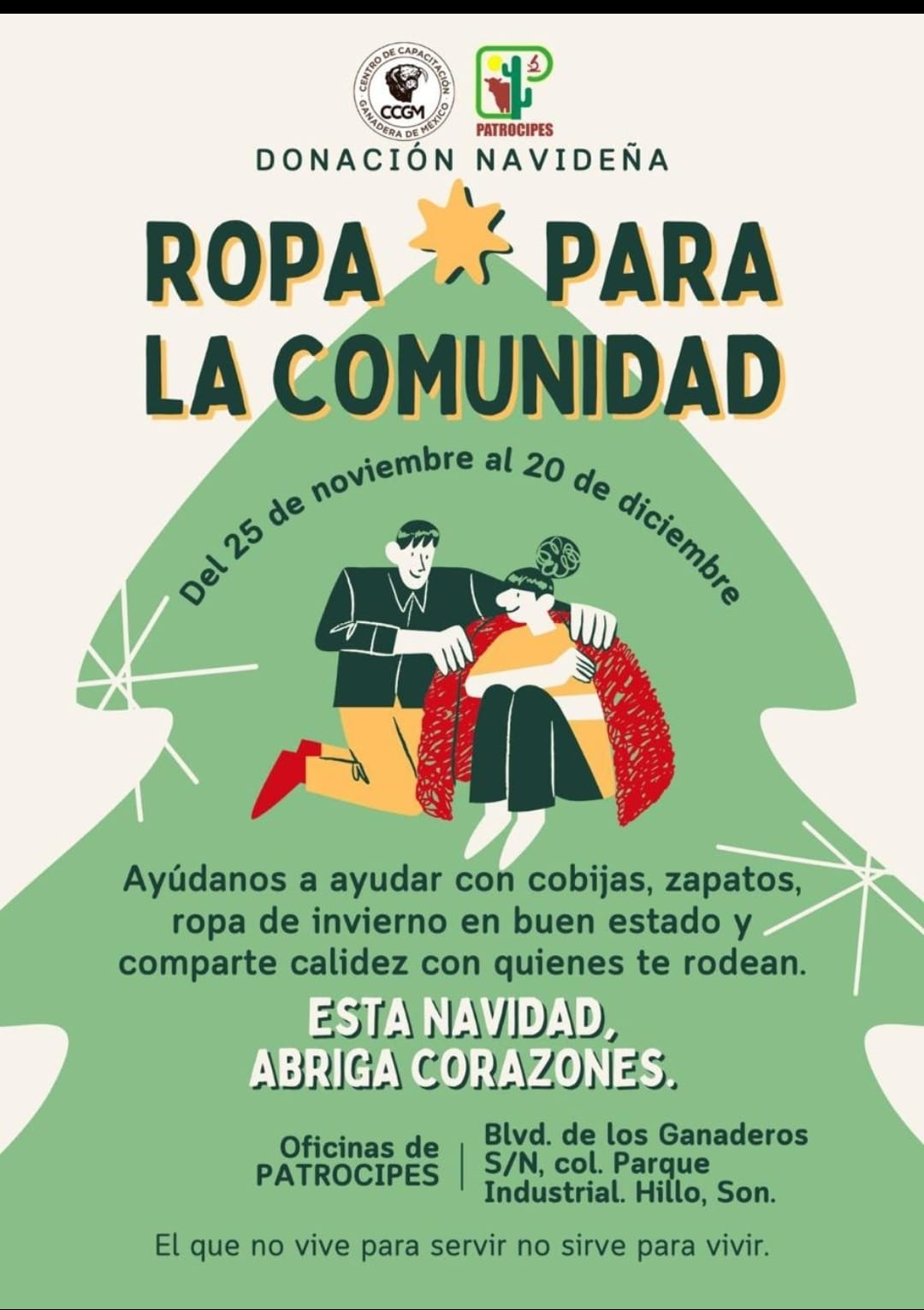 Hermosillo, Sonora. El Patronato del Centro de Investigaciones Pecuarias del Estado de Sonora, A.C (Patrocipes) y el Centro de Capacitación Ganadera de México, iniciaron una campaña navideña de recolección de ropa invernal para apoyar a familias en situación vulnerable.