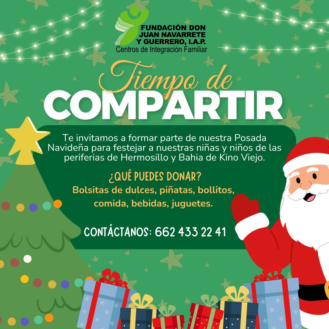 Bajo el mensaje “Tiempo de Compartir”, la organización hace un llamado a la comunidad hermosillense, así como al sector empresarial, para sumarse con apoyos que permitan realizar una posada destinada a menores de las periferias de Hermosillo y de la localidad de Bahía de Kino Viejo.