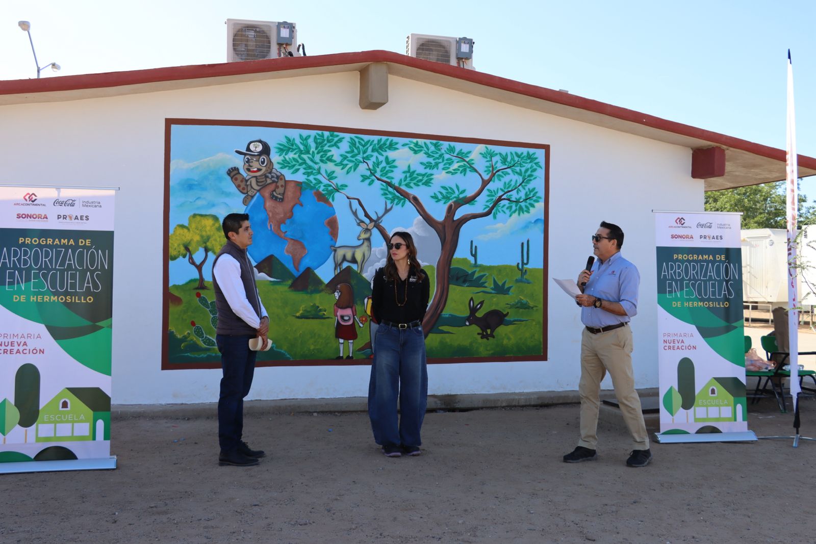 Hermosillo, Sonora, 02 de diciembre de 2025.- Arca Continental, uno de los embotelladores de Coca-Cola más importantes del mundo, y Coca-Cola México en colaboración con la Procuraduría Ambiental del Estado de Sonora, inauguraron en la Primaria Nueva Creación Pedregal un proyecto integral de arborización escolar, con el propósito de promover la conservación del medio ambiente a través de infraestructura verde, educación ambiental y la creación de espacios más resilientes.