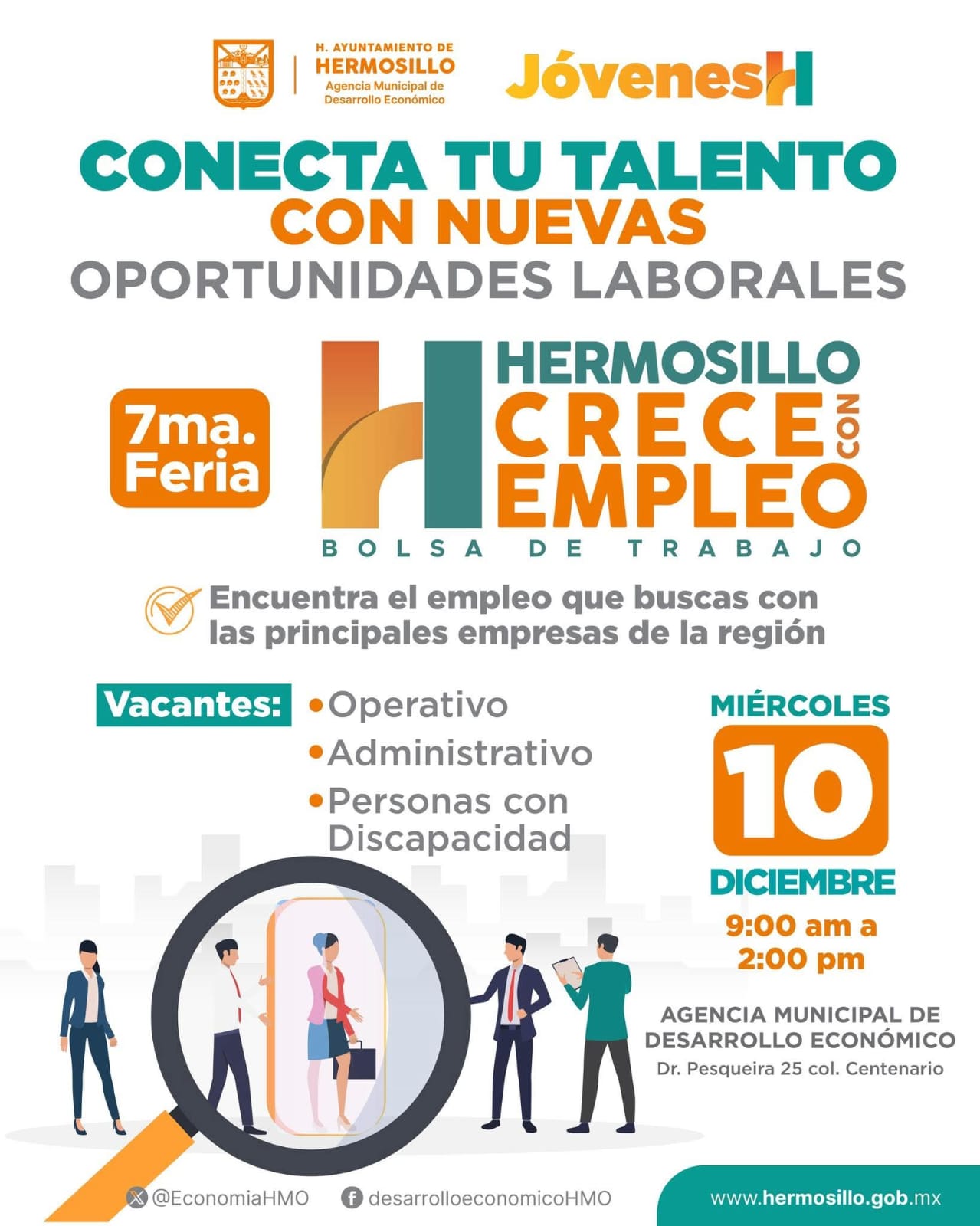 Hermosillo Sonora; 8 de diciembre, 2025.- La Agencia Municipal de Desarrollo Económico, AMDE, en coordinación con el Instituto Hermosillense de la Juventud invita a la Séptima Feria Hermosillo CRECE con Empleo el próximo miércoles 10 de diciembre.