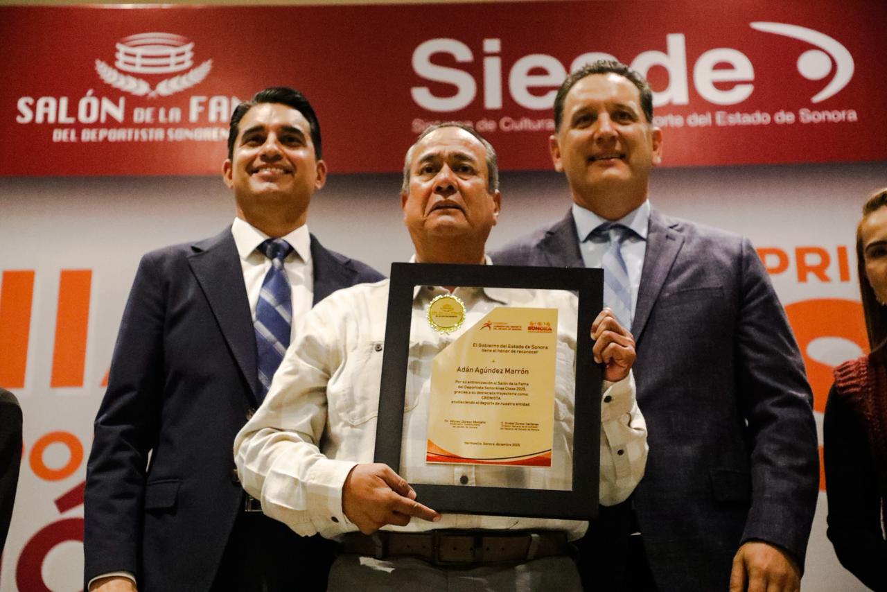Hermosillo, Sonora, 22 de diciembre del 2025.- Trabajar como papelerito para La Voz del Puerto a los nueve años de edad, le abrió el camino a Adán Agúndez Marrón para convertirse en cronista deportivo y acumular una trayectoria mayor a las cuatro décadas que lo inmortalizaron en la Clase 2025 del Salón de la Fama del Deportista Sonorense.