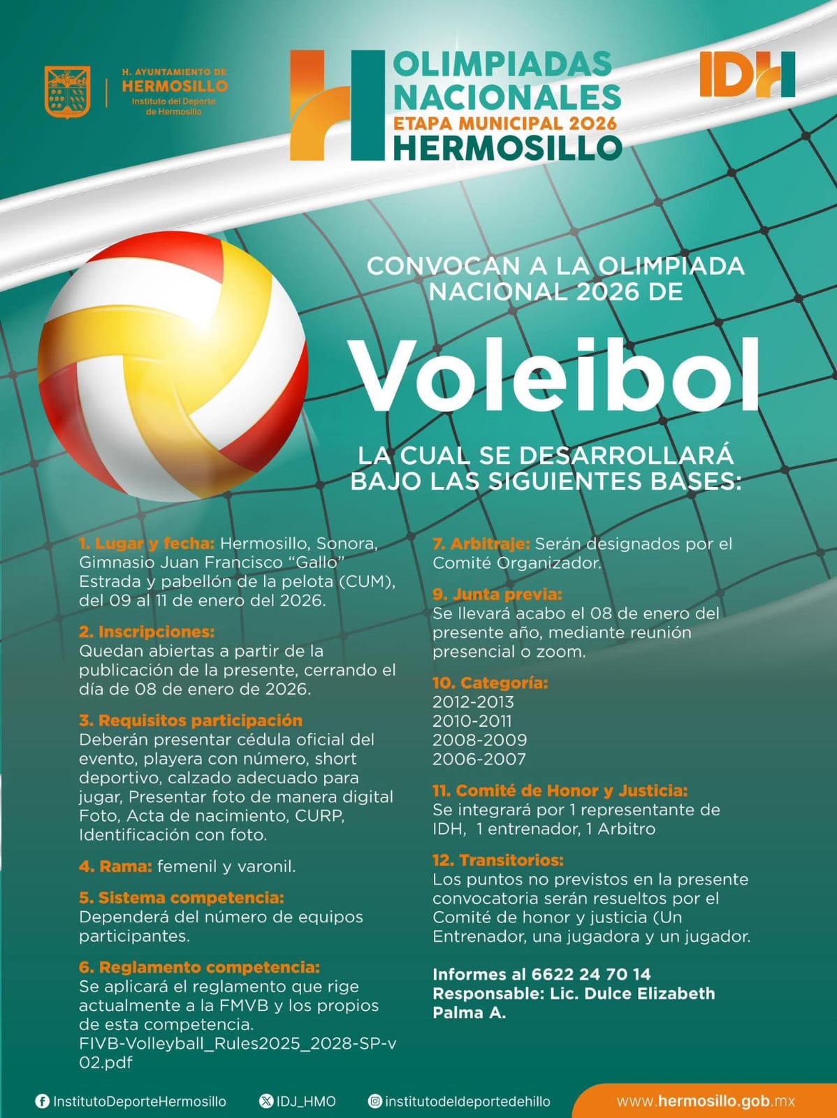Hermosillo, Sonora; 8 de enero, 2026.- El Instituto del Deporte de Hermosillo (IDH), en coordinación con el Ayuntamiento de Hermosillo, lanzó la convocatoria oficial para la etapa municipal de voleibol, como parte del proceso rumbo a la Olimpiada Nacional 2026.