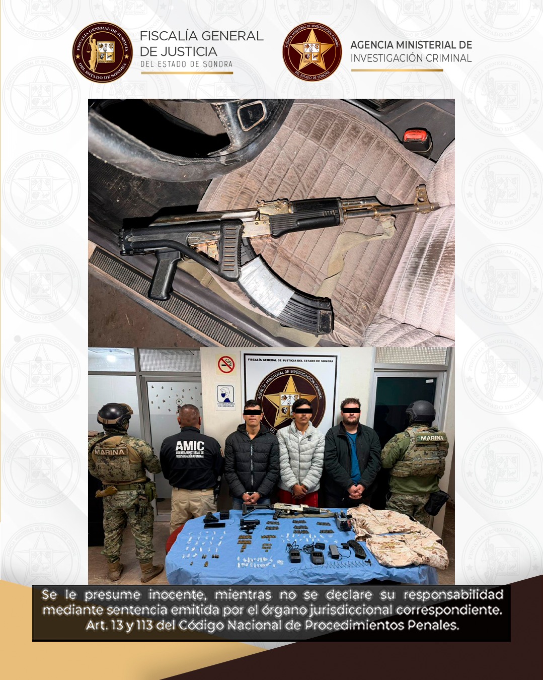 Cajeme, Sonora, 8 de enero de 2026.– La Fiscalía General de Justicia del Estado de Sonora (FGJES), en coordinación con la Agencia Ministerial de Investigación Criminal (AMIC) y con el apoyo de la Secretaría de Marina (SEMAR) y la Secretaría de la Defensa Nacional (DEFENSA), ejecutó siete cateos simultáneos en distintos puntos de la localidad de Estación Corral, municipio de Cajeme, como parte de investigaciones en curso.