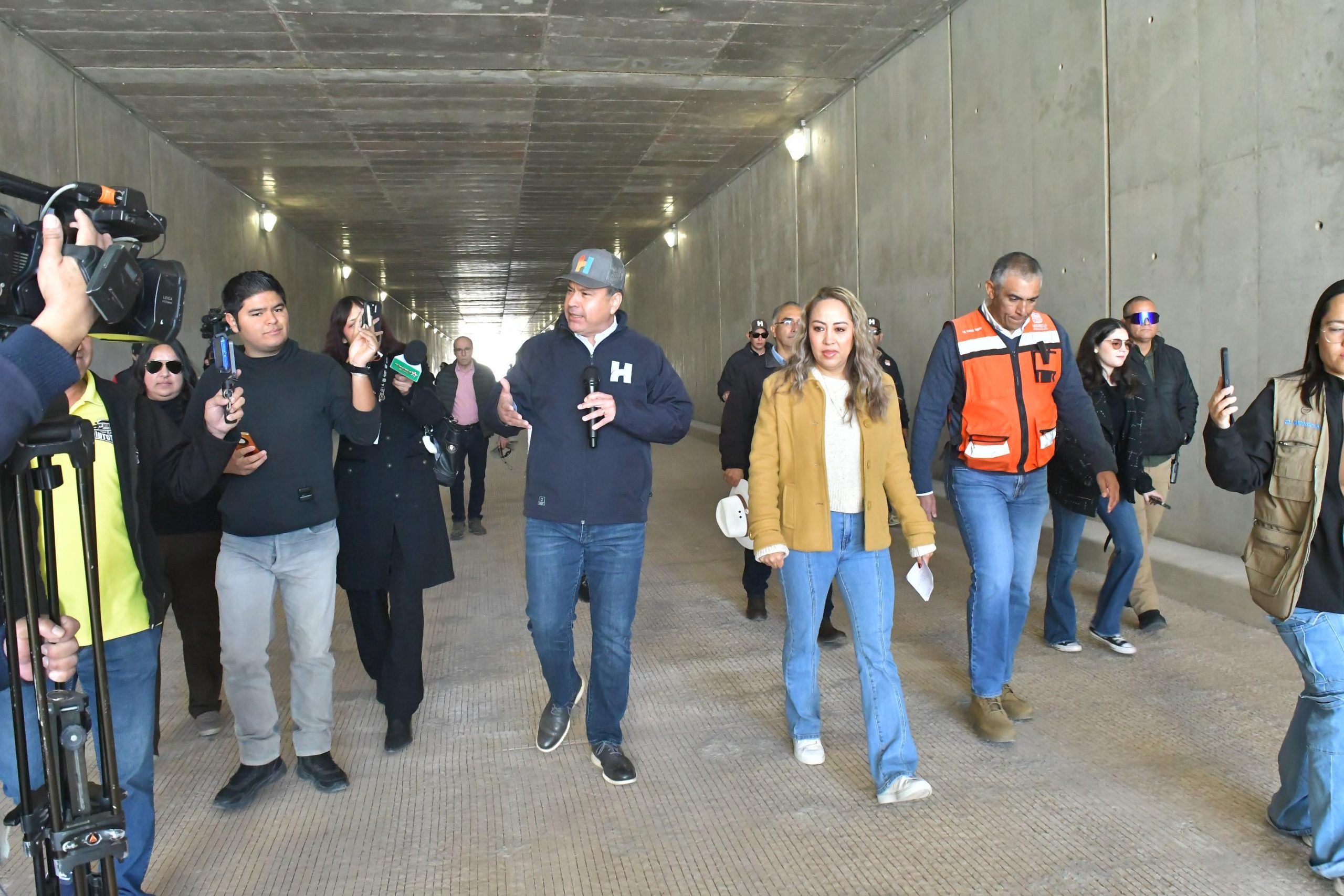 La directora de la Desarrollo de Infraestructura destacó que tras la apariencia despejada actual del paso a desnivel hubo mucho trabajo previo, en coordinación con la Comisión Federal de Electricidad y empresas proveedoras de servicios como internet y gas natural, para la colocación subterránea de todas sus infraestructuras y mencionó que resta poco por hacer para la reubicación de postes y cableado faltantes.
