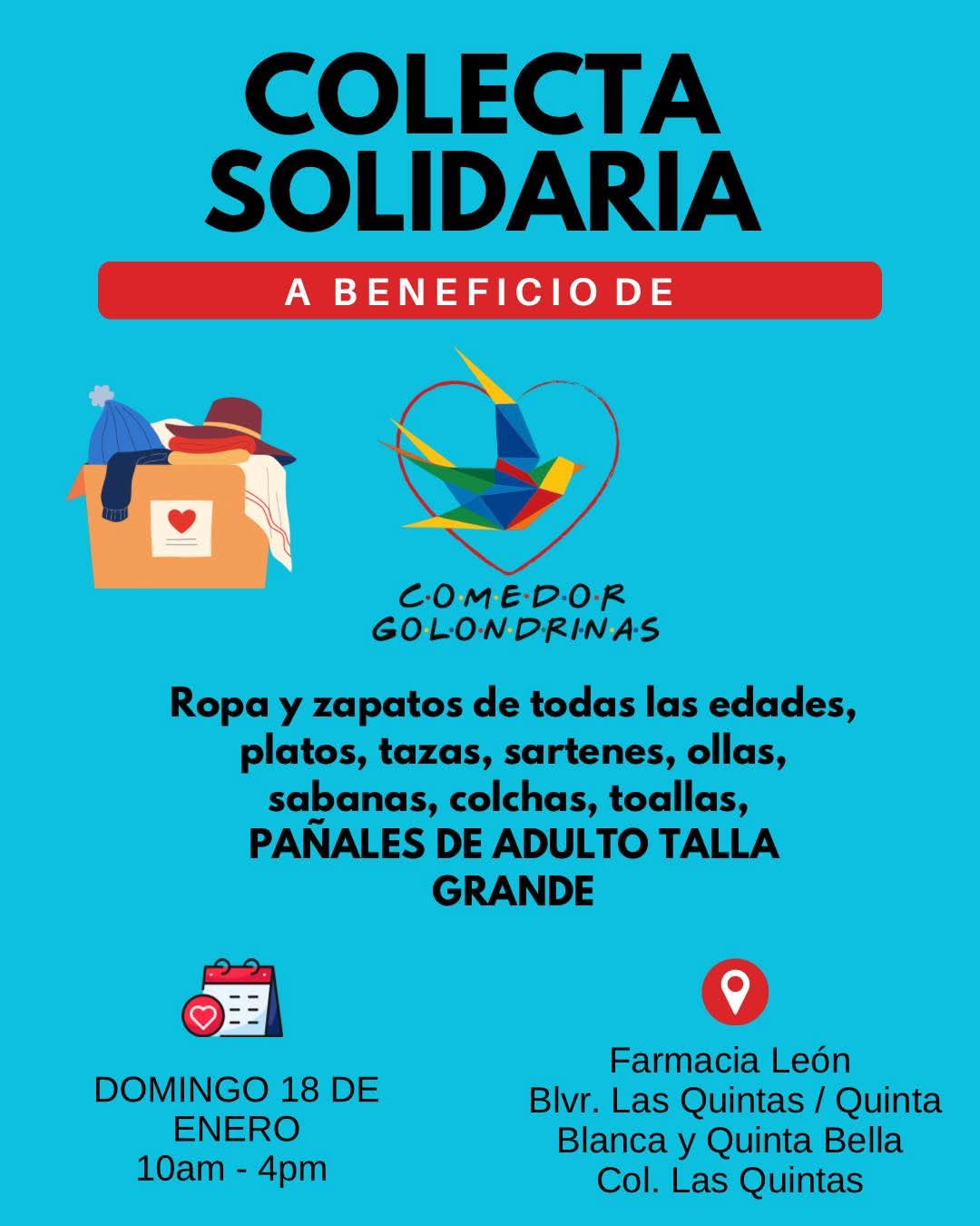 Con el objetivo de apoyar a personas en situación vulnerable, este domingo 18 de enero se realizará una colecta solidaria a beneficio del Comedor Golondrinas, espacio que brinda apoyo alimentario a quienes más lo necesitan.