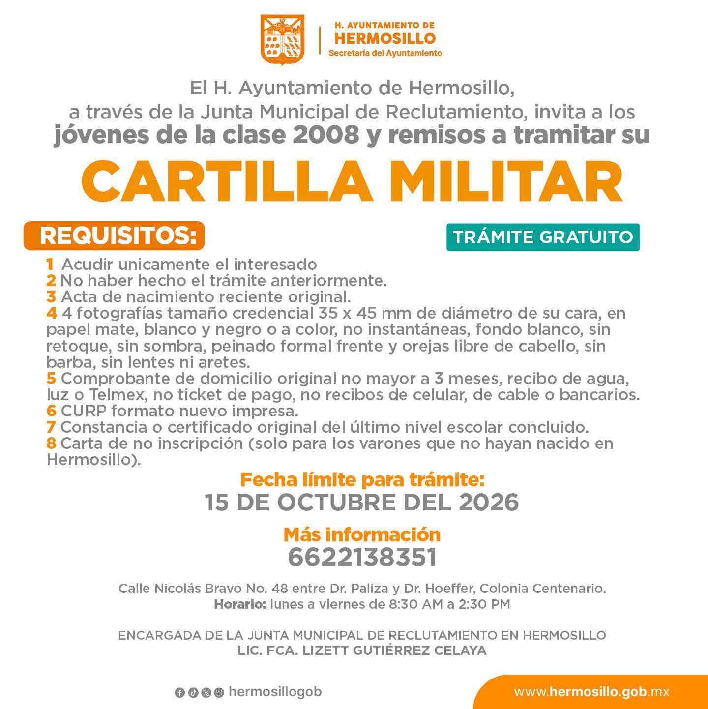 Hermosillo, Sonora; 26 de enero, 2026.- El personal de la dirección de Servicios de Gobierno de la Secretaría del Ayuntamiento de Hermosillo ya está listo para atender a los jóvenes clase 2008 y remisos para asistirlos en el trámite por primera vez de su cartilla del Servicio Militar Nacional, conforme a la convocatoria 2026, informó Eduardo Acuña Padilla.