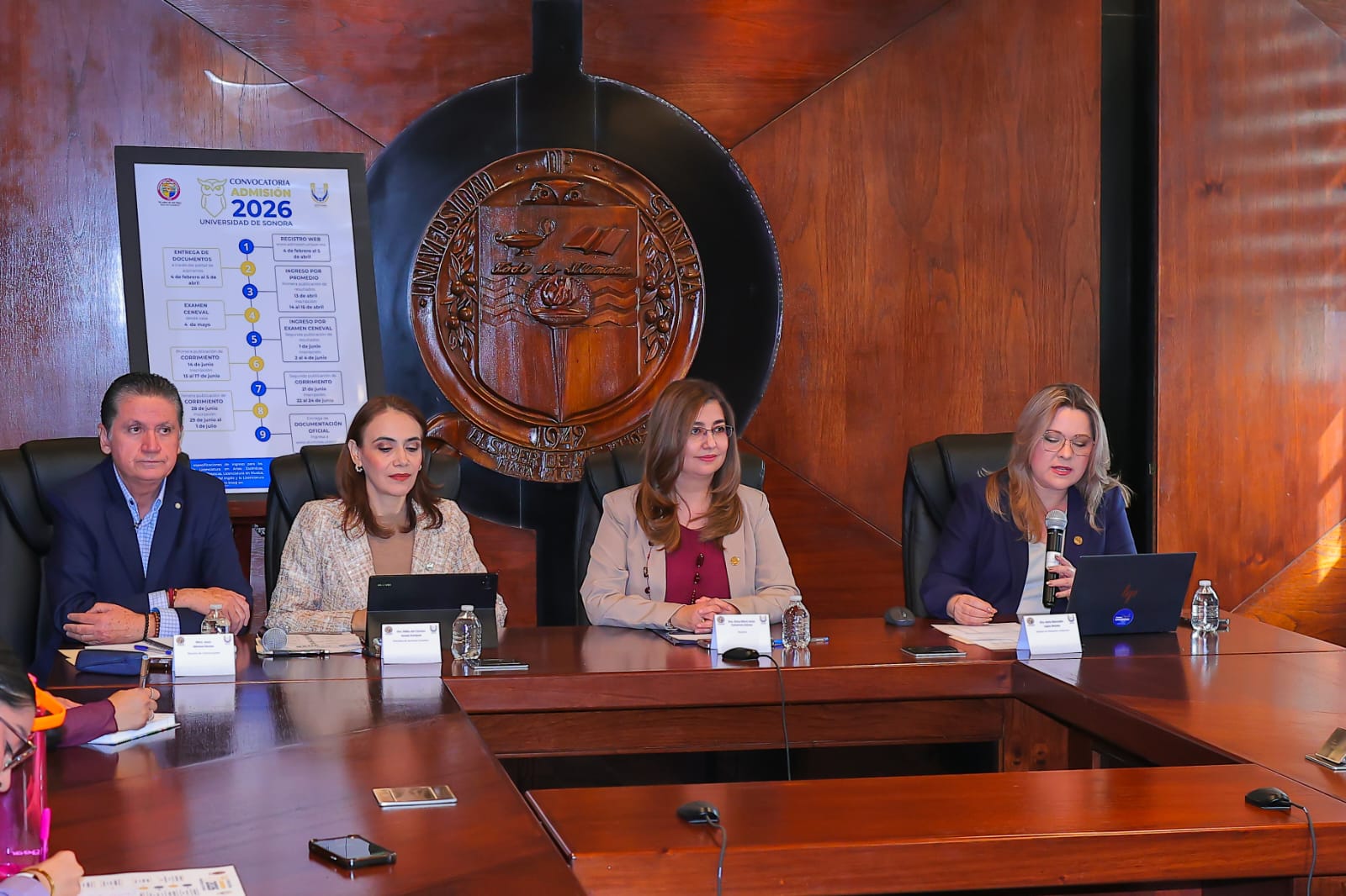La rectora Dena María Camarena Gómez, acompañada de Karla Mercedes López Montes, directora de Planeación y Evaluación; Milka del Carmen Acosta Enríquez, directora de Servicios Escolares; y Jesús Moreno Durazo, director de Comunicación, anunció la convocatoria que inicia este 4 de febrero.