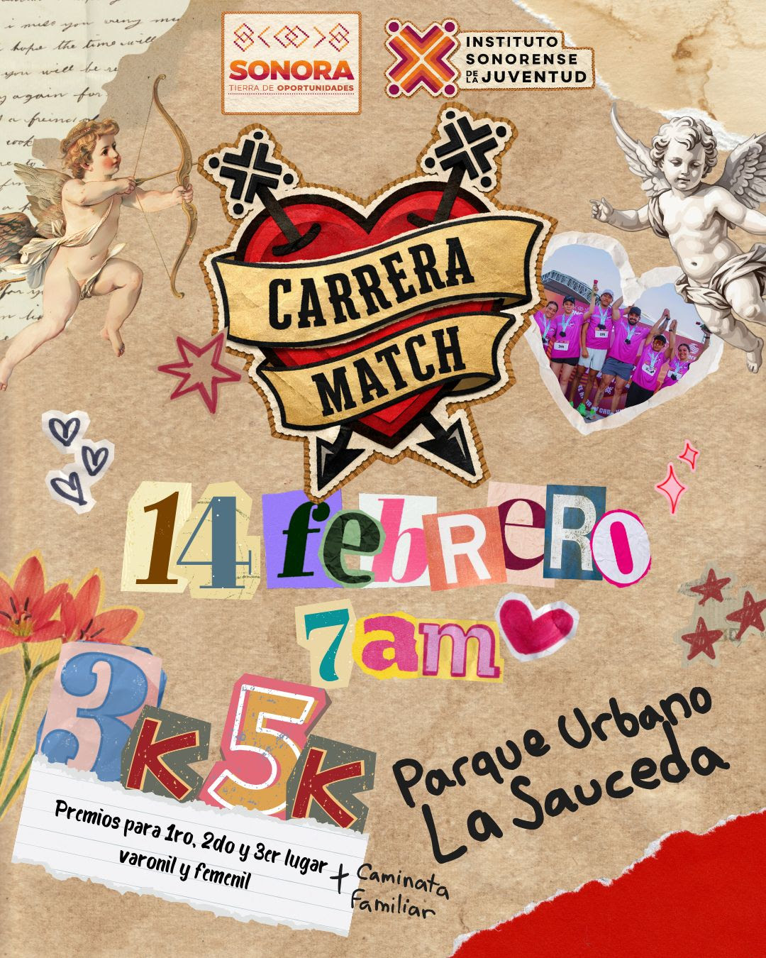 Hermosillo, Sonora; 4 de febrero de 2026.- El Gobierno de Sonora, a través del Instituto Sonorense de la Juventud (ISJ), anunció la realización de la Carrera Match 2026, un evento deportivo que se llevará a cabo el próximo 14 de febrero, a las 7:00 horas, en el marco de la conmemoración del Día del Amor y la Amistad.