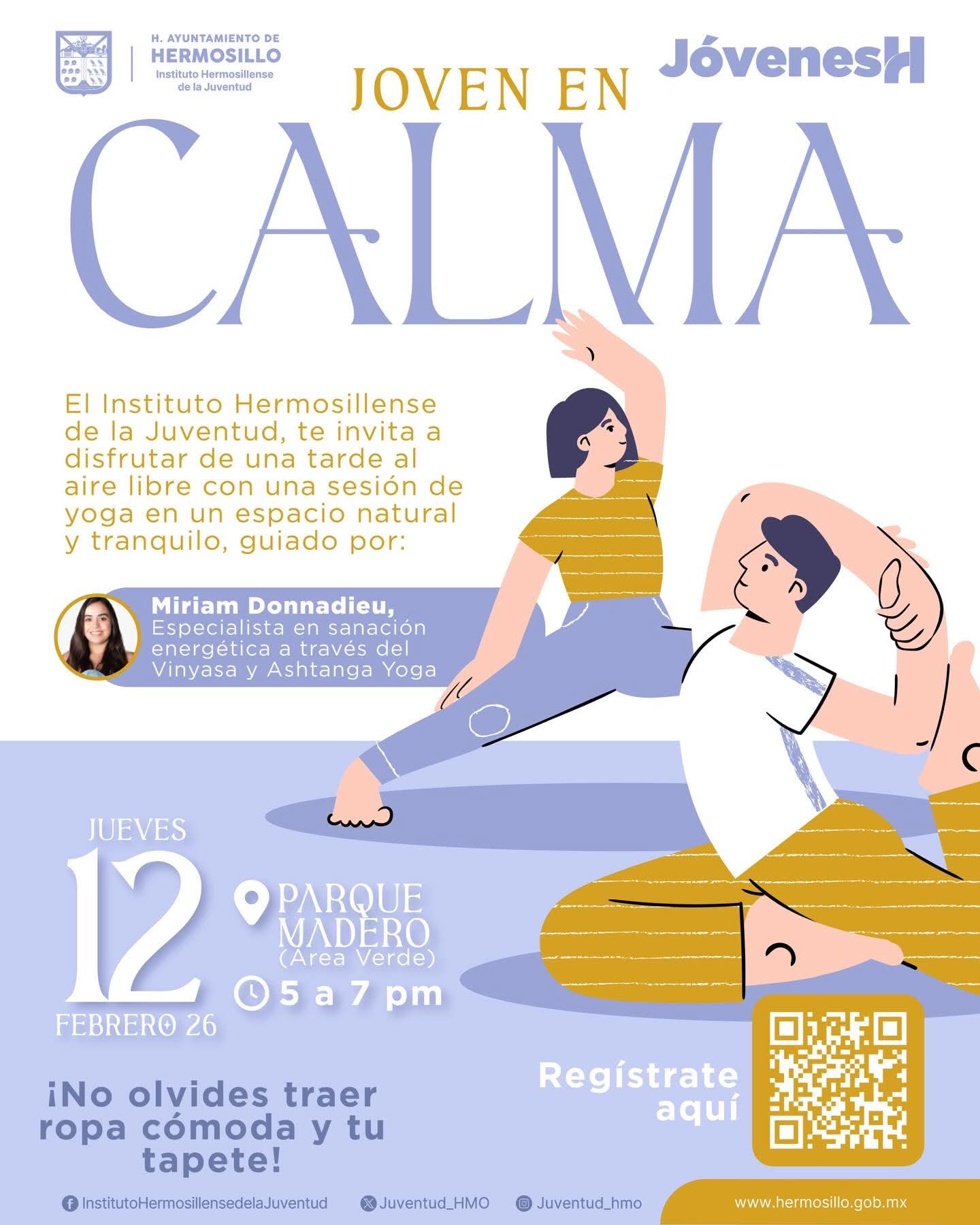 Hermosillo, Sonora; 9 de febrero, 2026.- El Gobierno Municipal de Hermosillo, a través del Instituto Hermosillense de la Juventud (IHJ), llevará al área verde del Parque Madero la sesión de yoga al aire libre “Joven en Calma”, el próximo jueves 12 de febrero, Informó Francisco Villaescusa.