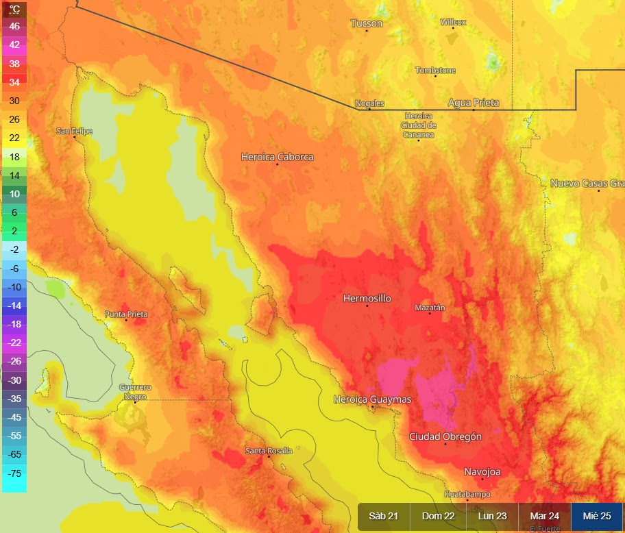 A partir del domingo se prevé un aumento en las temperaturas máximas por las tardes y, durante la próxima semana, se mantendrá el pronóstico con tardes cálidas, donde se proyectan valores de 30 °C a 35 °C en la región centro y sur del estado de Sonora.