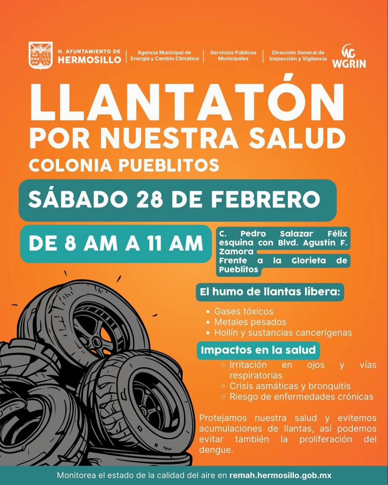 Hermosillo, Sonora; 25 de febrero, 2026.-En la colonia Pueblitos ubicada al Norte de la ciudad se realizará este sábado 28 de febrero el “Llantatón por nuestra salud” organizado por el Ayuntamiento de Hermosillo a través de la Agencia Municipal de Energía y Cambio Climático, AMECC.
