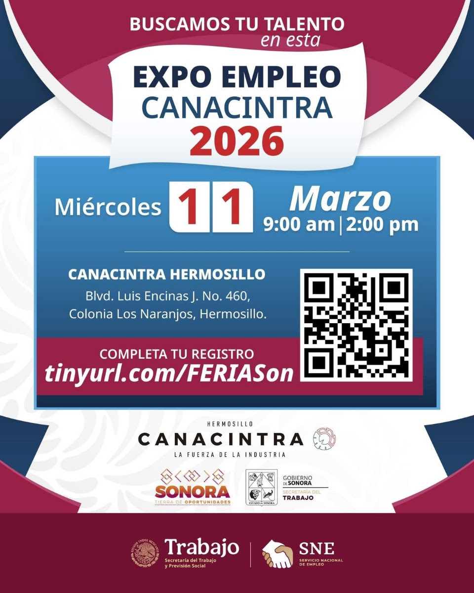 | Hermosillo, Sonora; 10 de marzo de 2026.- Para generar mayores oportunidades de empleo, el Gobierno de Sonora, a través de la Secretaría del Trabajo, en colaboración con Canacintra Hermosillo, realizará la segunda Expo Empleo.