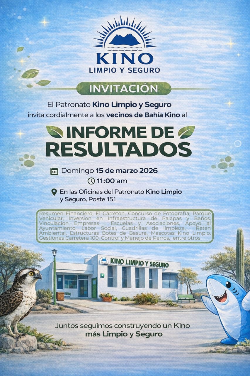 El Patronato Kino Limpio y Seguro invitó a los vecinos de Bahía de Kino este domingo 15 de marzo, a asistir al informe de resultados donde se presentarán las acciones y avances logrados en distintos proyectos enfocados en mejorar la comunidad.