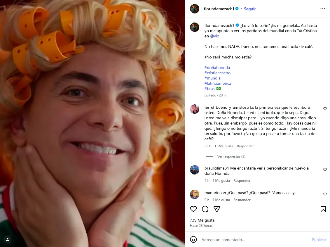 En su cuenta de Instagram, la actriz compartió su sorpresa con un mensaje lleno de humor y nostalgia: “¿Lo vi ó lo soñé? ¡Es mi gemela!… Así hasta yo me apunto a ver los partidos del mundial con la Tía Cristina en @vix”. Con estas palabras, Florinda reconoció la similitud entre su personaje y la creación de Castro, generando conversación entre sus seguidores.