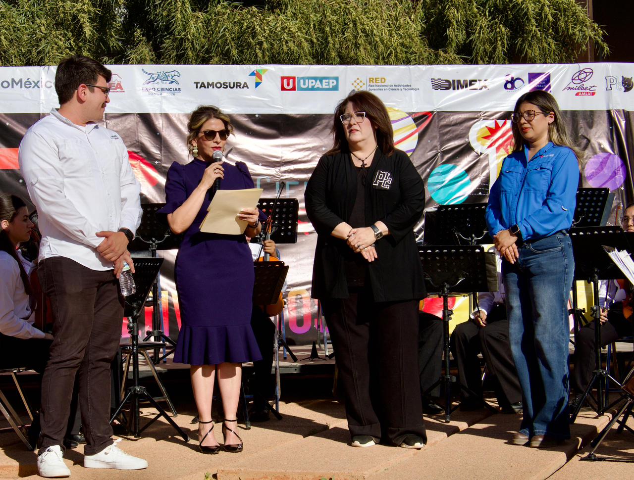 “La educación es la herramienta más poderosa para cambiar el mundo, pero la ciencia es la brújula que nos permite entenderlo y transformarlo”, afirmó la presidenta municipal, acompañada de Edgar Joel López Romo y Cesar Gerardo Ortega López, de Dimex Ideas; Alba Nora Sandoval Miranda, directora de la preparatoria Lázaro Cárdenas; e Iraida Medina Hernández, de Desarrollo comunitario de Grupo México.
