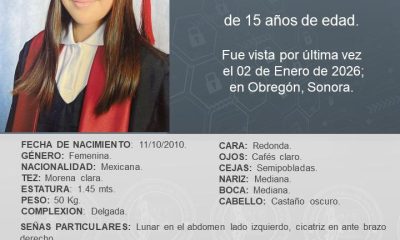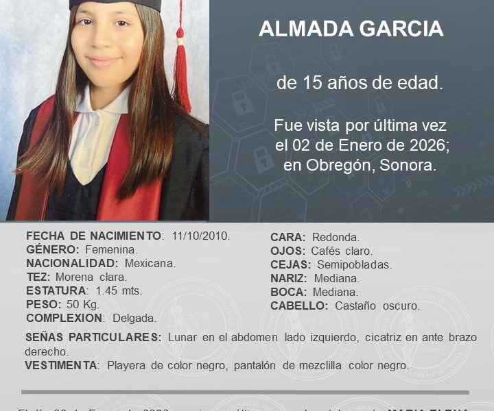 La Fiscalía General de Justicia del Estado de Sonora activó la Alerta Amber para localizar a María Elena Almada García, de 15 años de edad, reportada...