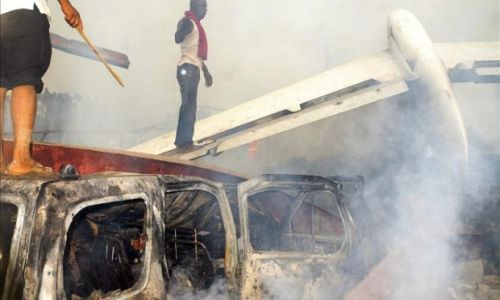 Según los testigos el avión explotó y se incendió en el aire antes de estrellarse junto a un depósito de combustible del aeropuerto.