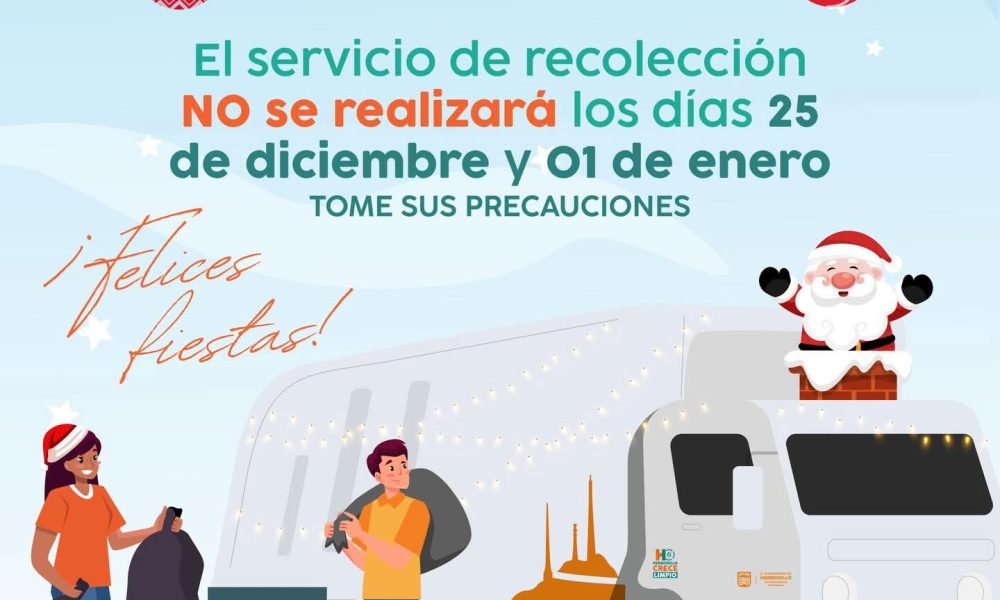 Hermosillo, Sonora; 22 de diciembre, 2025.- Como cada año, los días jueves 25 de diciembre y 1 de enero de 2026 se suspenderá el servicio de recolección...