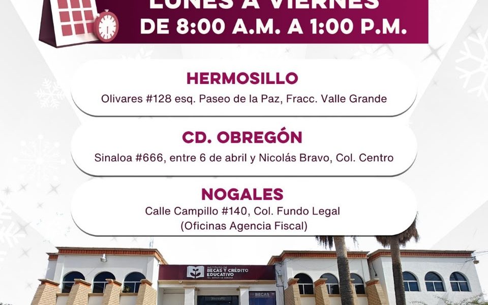 Hermosillo, Sonora; 20 de diciembre de 2025.– Las oficinas del Instituto de Becas y Crédito Educativo del Estado de Sonora (Ibcees) contarán con personal de guardia...