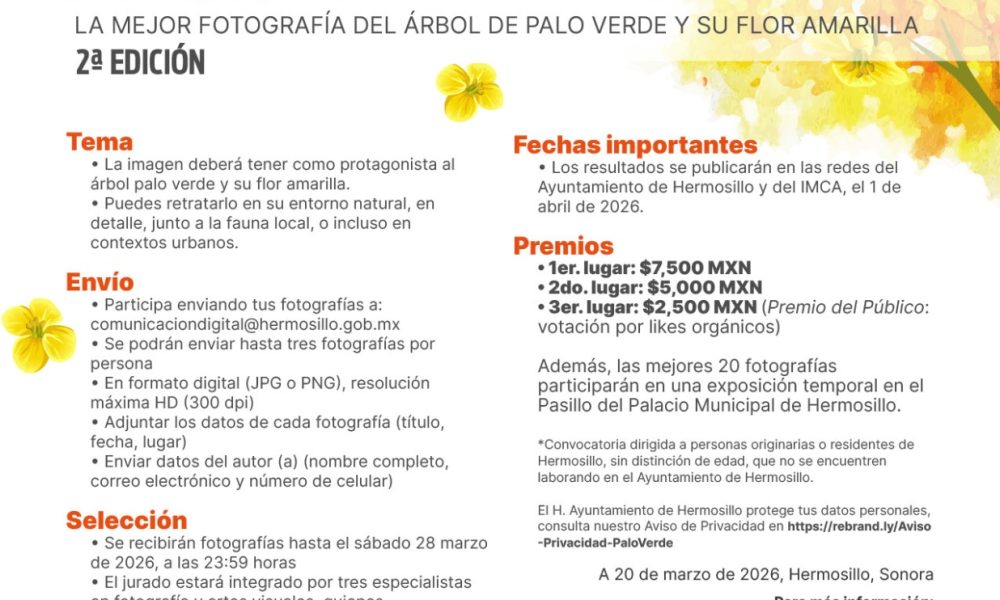 Hermosillo, Sonora, 22 de marzo, 2026.- El Ayuntamiento de Hermosillo, a través del Instituto Municipal de Cultura y Arte (IMCA), invita a participar a personas originarias o...