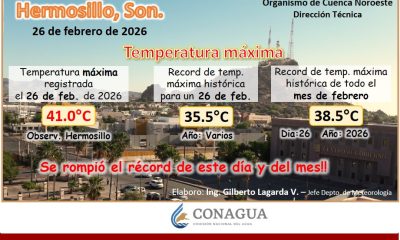Hermosillo, Sonora. La ciudad de Hermosillo registró este 26 de febrero una temperatura máxima de 41.0 grados centígrados, estableciendo un nuevo récord para esta fecha y...
