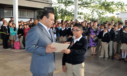 El alcalde Alejandro López Caballero asistió a la ceremonia de lunes cívico en la Escuela Secundaria Técnica número 74, de la colonia Puerta Real