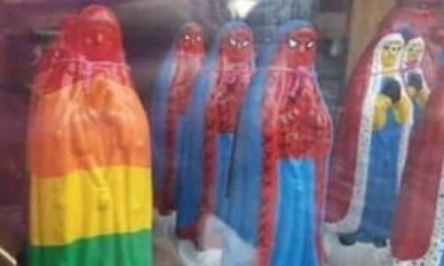 Visten Virgen de Guadalupe con colores de la bandera LGBTI