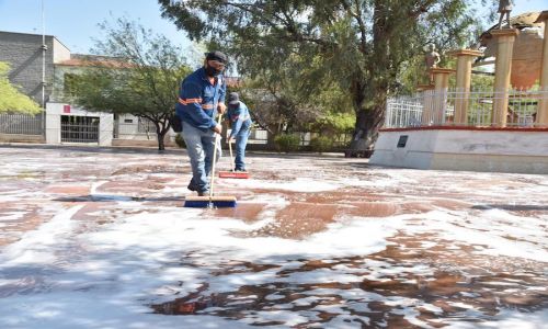 Realizan limpieza profunda en Plaza de Los Maestros en la colonia San Benito